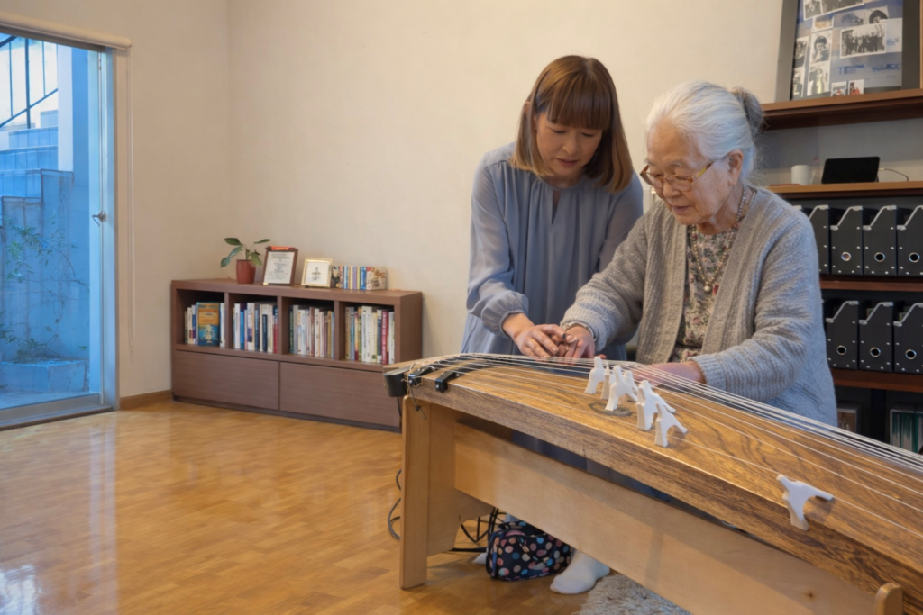 ある日、私が定期開催しているお寺での箏体験講座に、少し緊張した面持ちの80代の女性がいらっしゃいました。娘さんに連れられて参加されたその方は、お話しを伺うと、小学2年生の頃に少しだけ箏を習っていたとのこと。